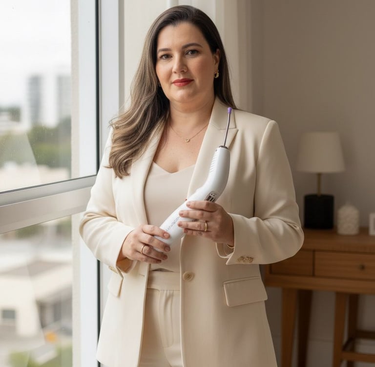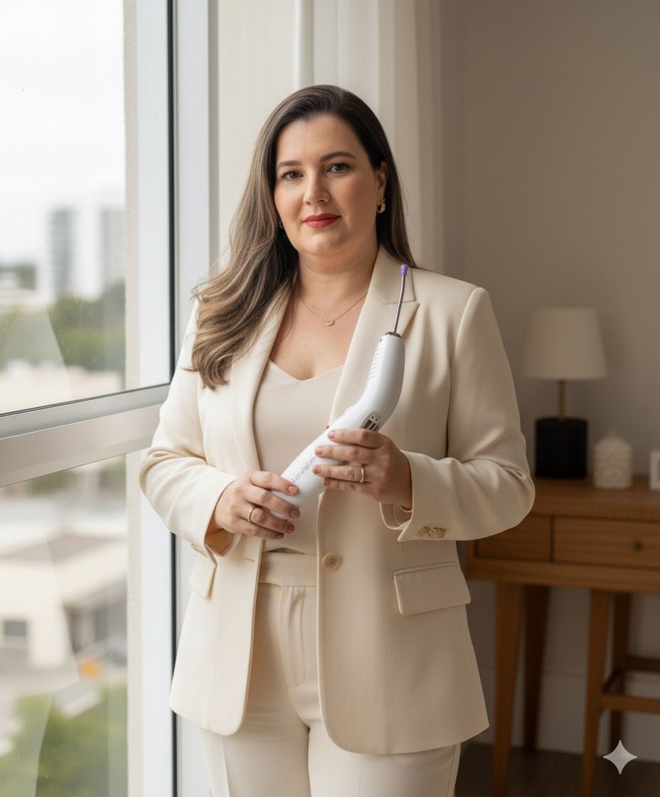 Cuidando com ciência, luz e acolhimento. Cada sessão é um encontro entre tecnologia e sensibilidade, unindo conhecimento técnico, escuta atenta e fotobiomodulação para promover alívio, equilíbrio e bem-estar em todas as fases da vida da mulher.